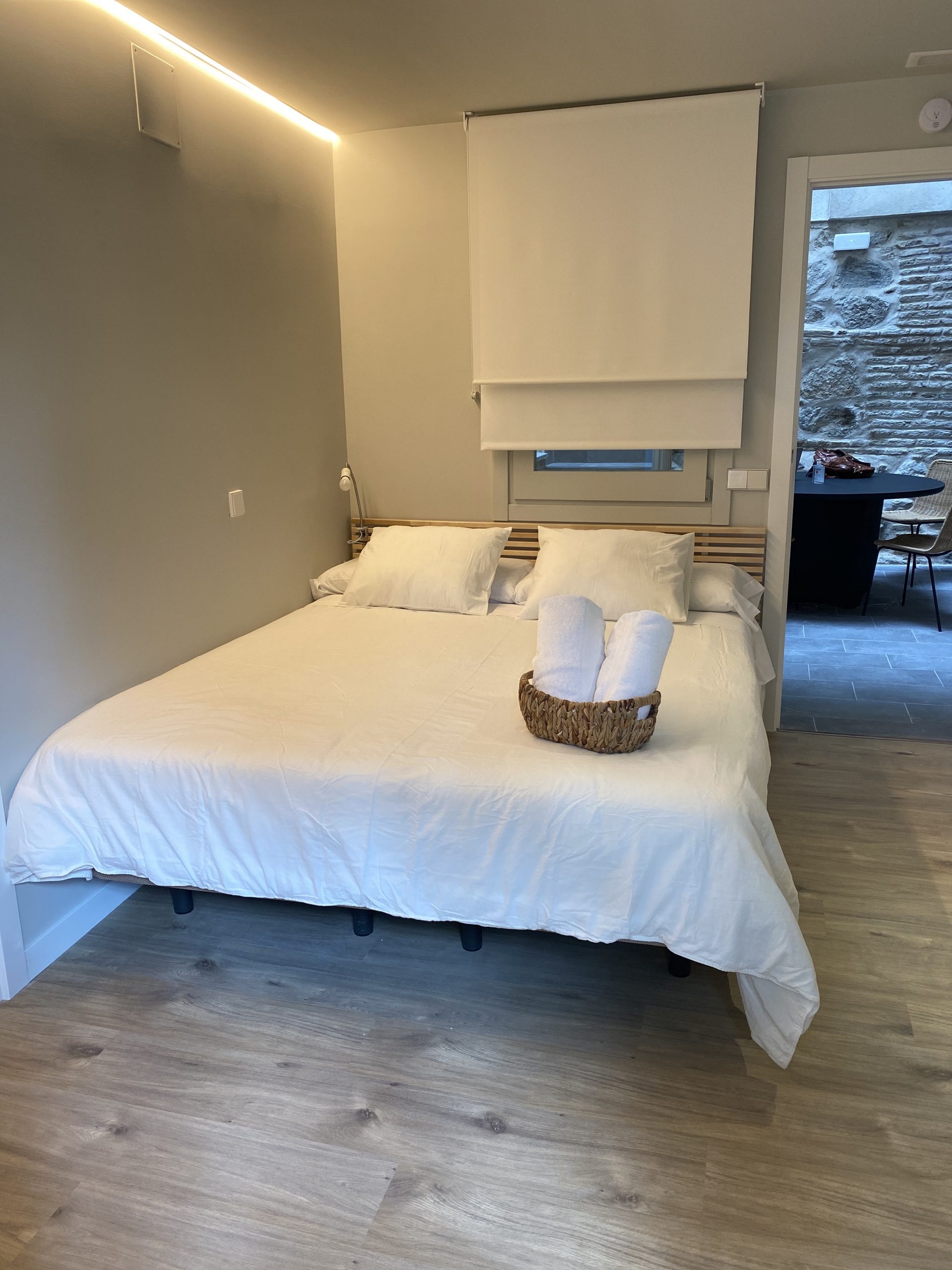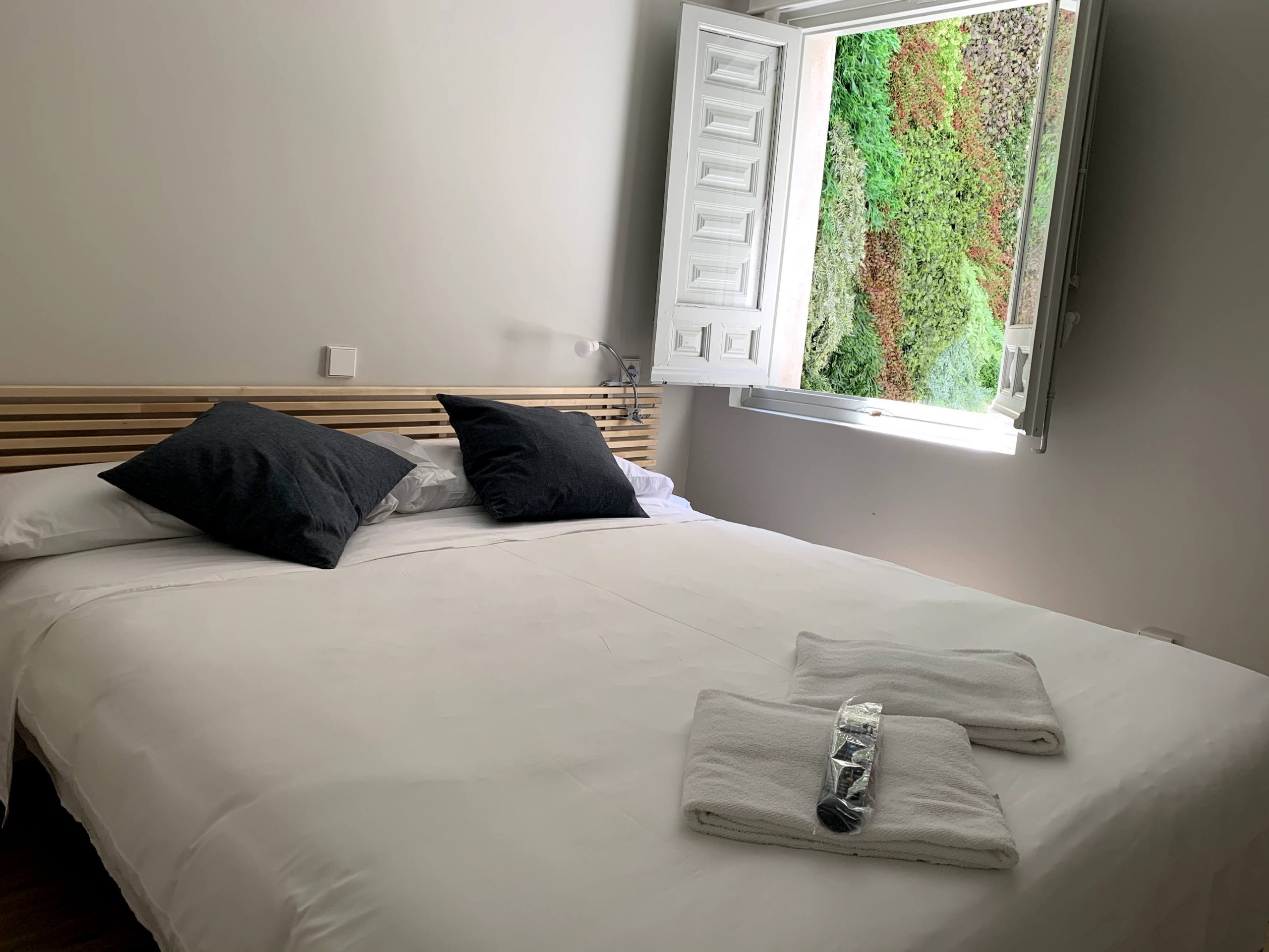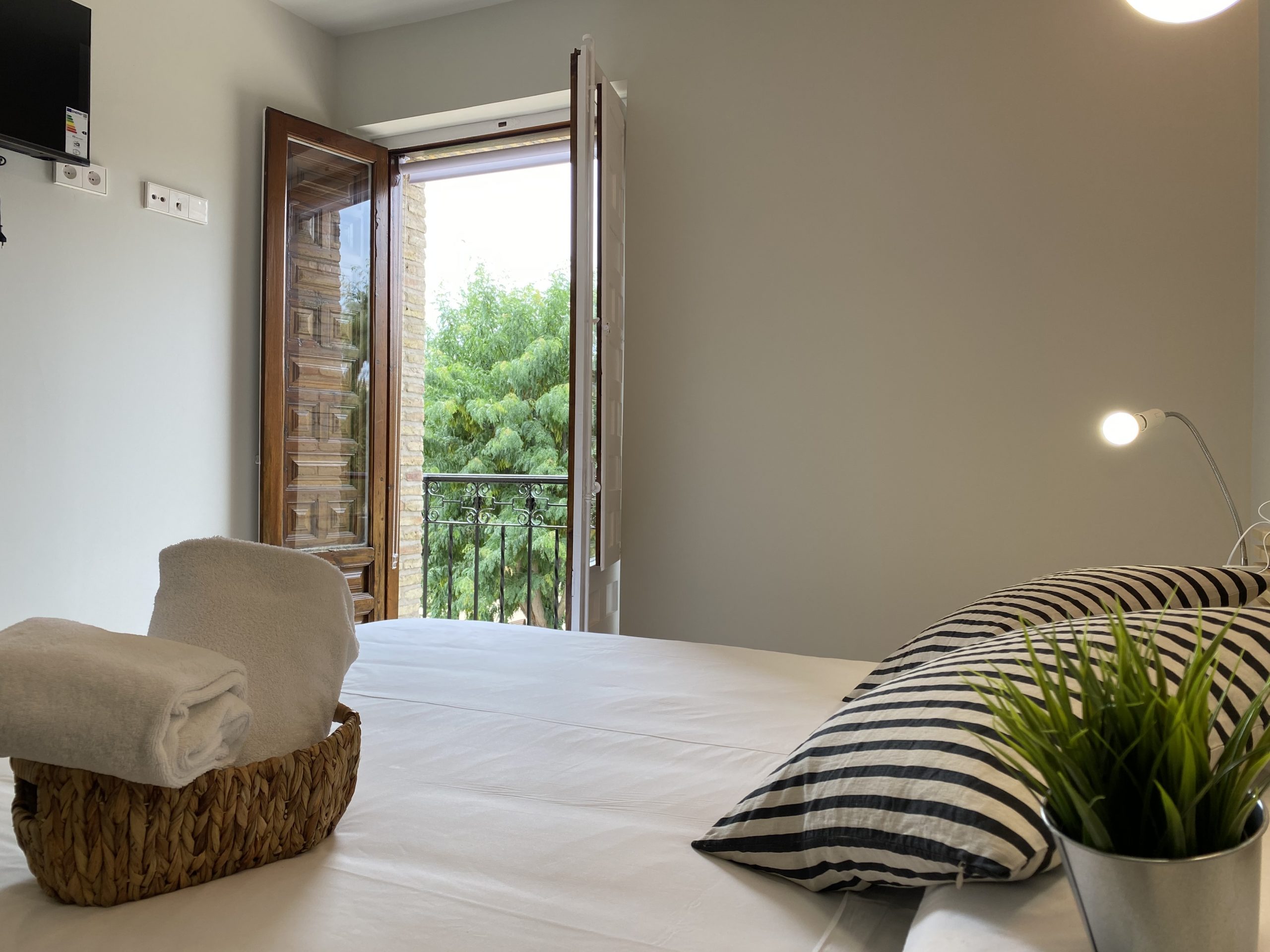 Habitación privada exterior con baño adaptado, recién reformado. Consta de cama de matrimonio (queen-size), toallas, gel, champú, secador, armario abierto, Smart TV, mini nevera, microondas y máquina de café Dolce gusto. Ideal para disfrutar de una auténtica experiencia Toledana junto al barrio judío. Estarás en un edificio rehabilitado con las mejores calidades de materiales, con un patio interior típicamente toledano.
