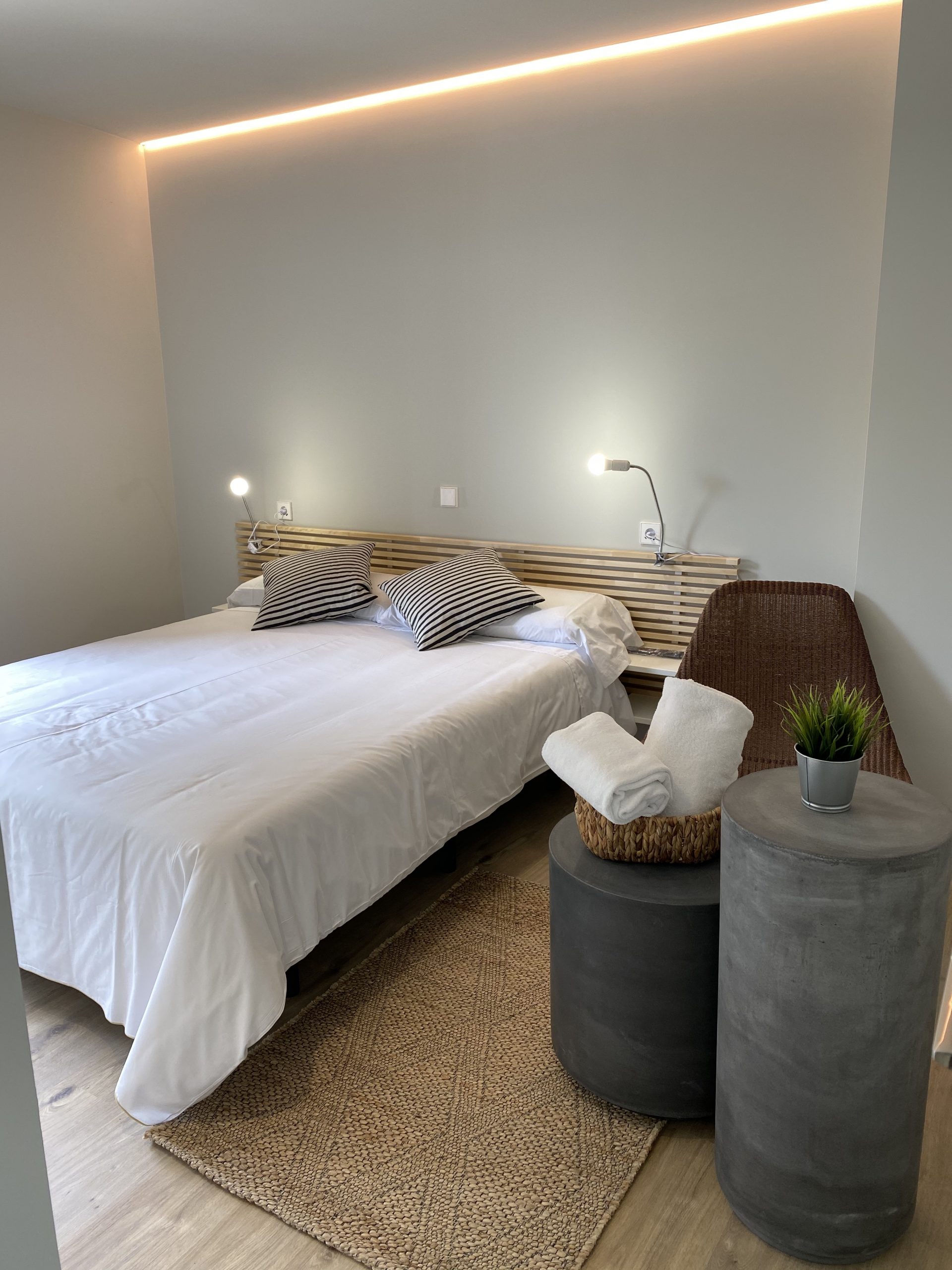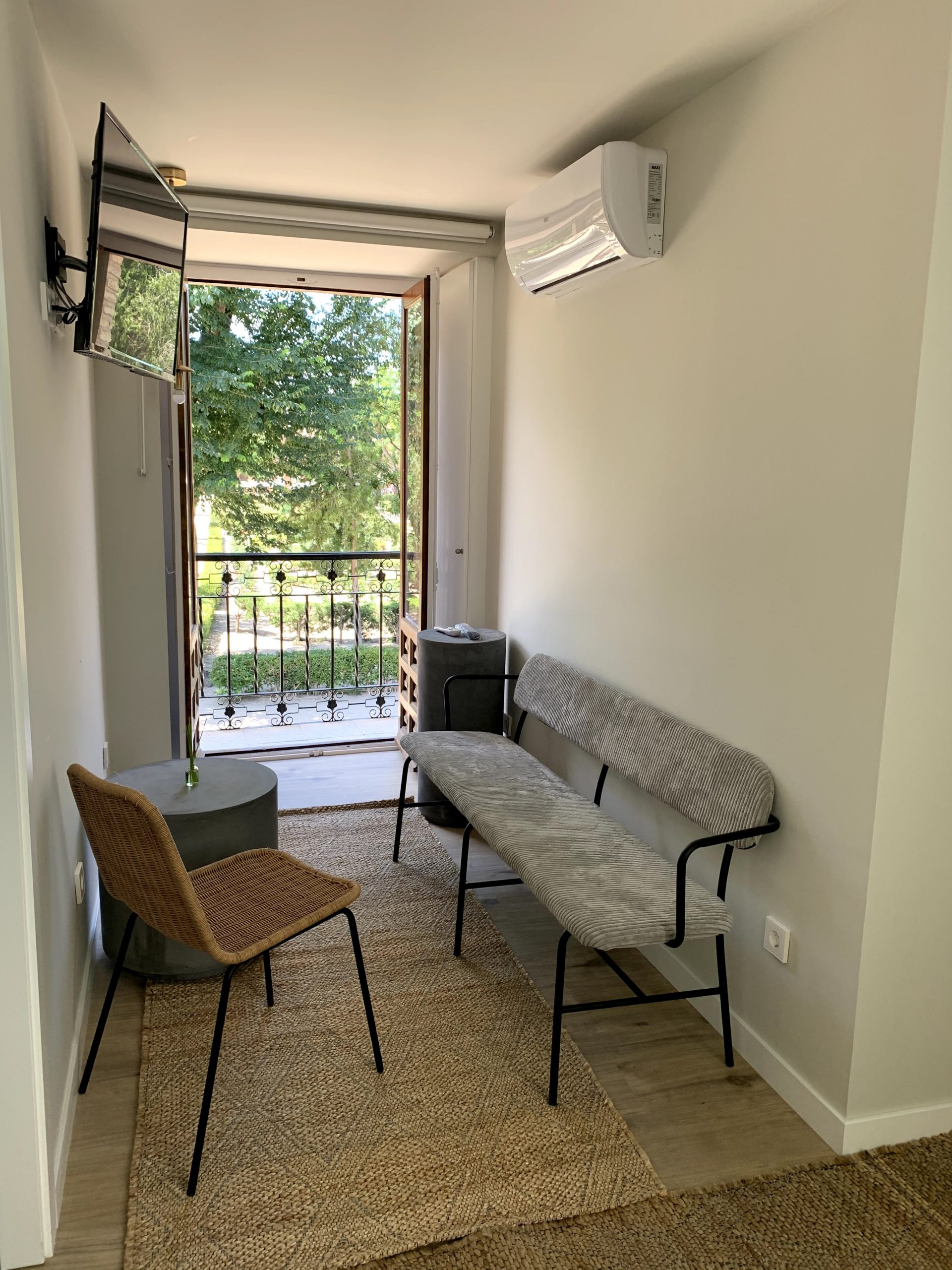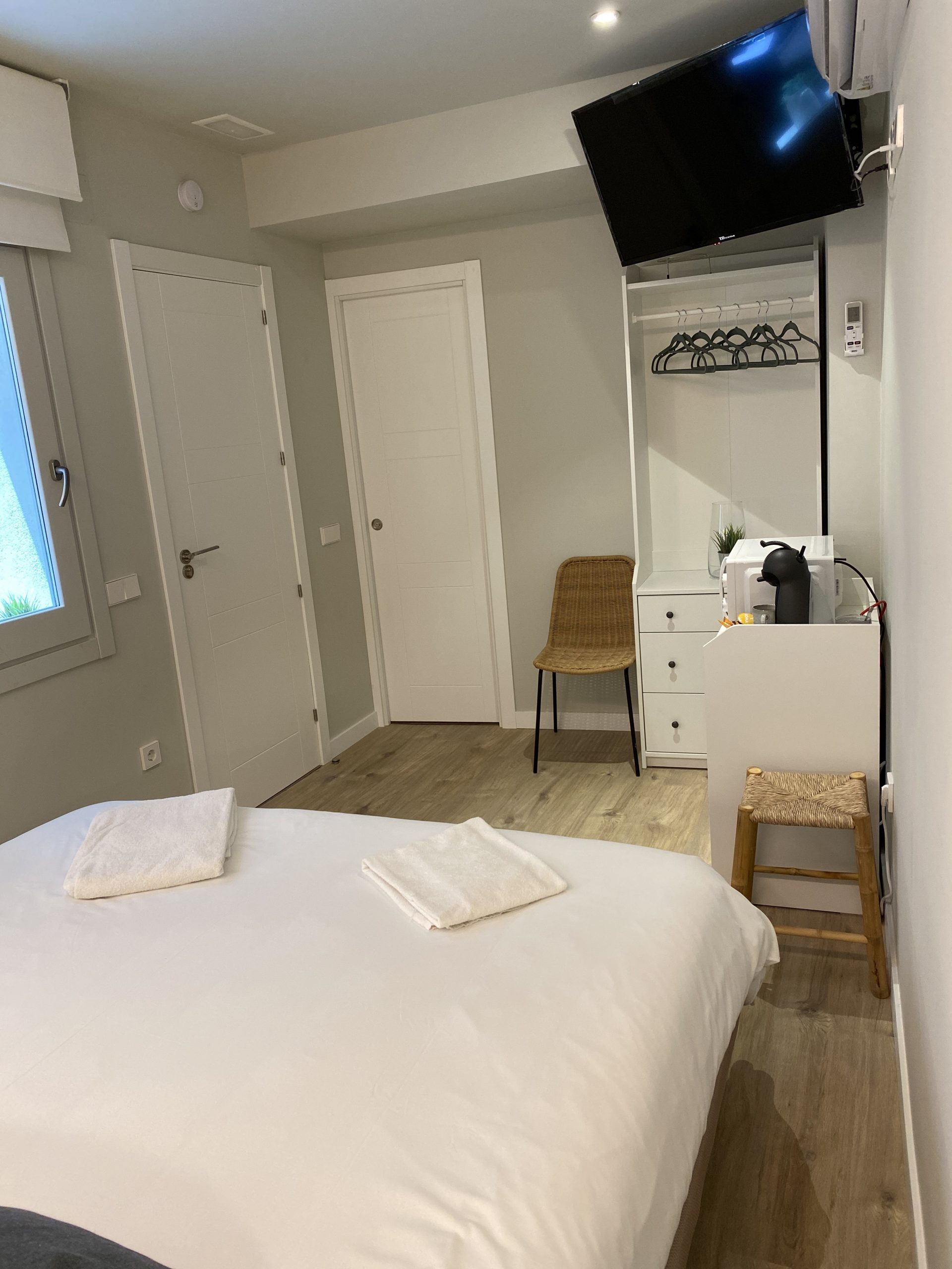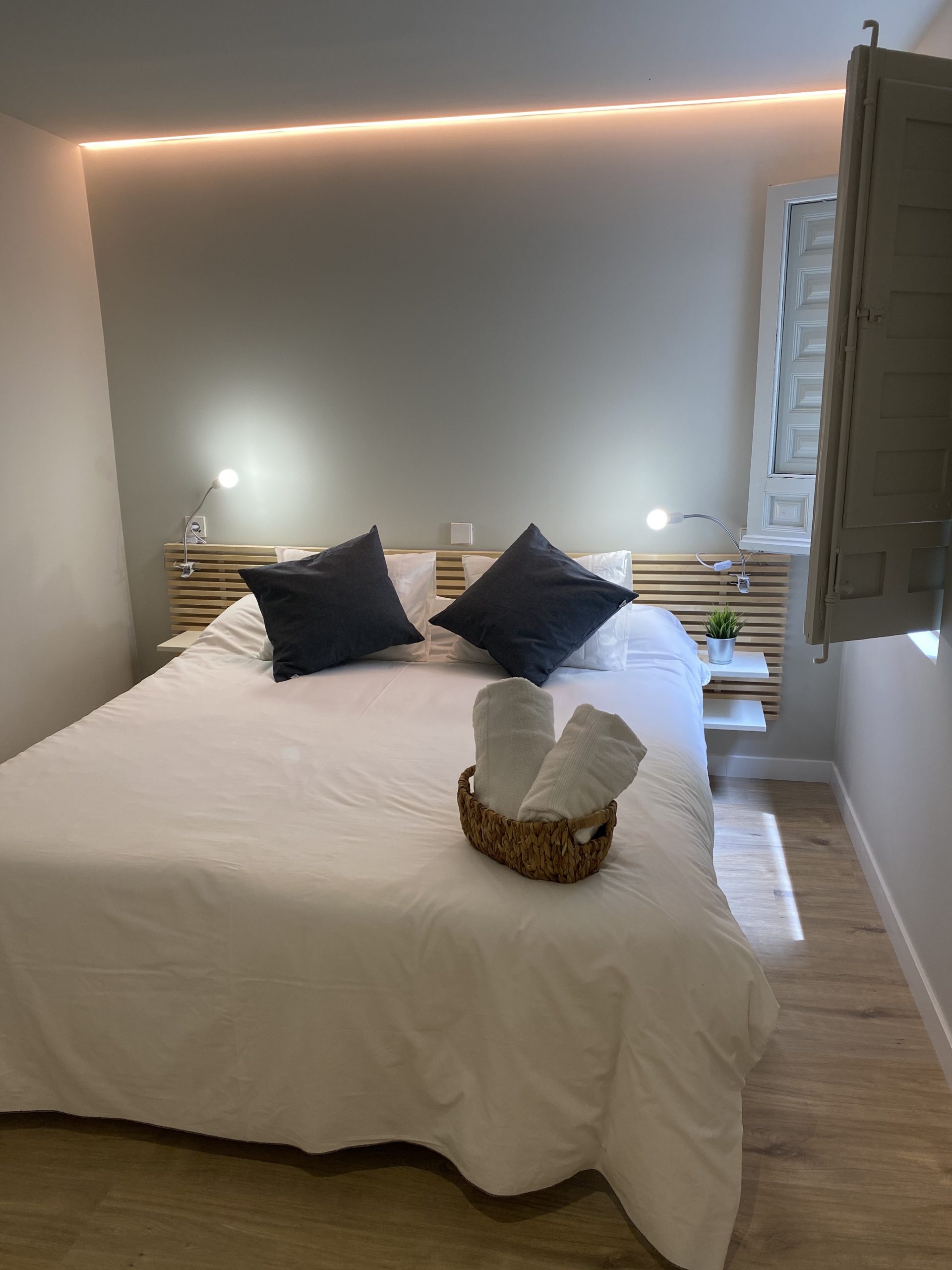 Habitación privada exterior con baño adaptado, recién reformado. Consta de cama de matrimonio (queen-size), toallas, gel, champú, secador, armario abierto, Smart TV, mini nevera, microondas y máquina de café Dolce gusto. Ideal para disfrutar de una auténtica experiencia Toledana junto al barrio judío. Estarás en un edificio rehabilitado con las mejores calidades de materiales, con un patio interior típicamente toledano.