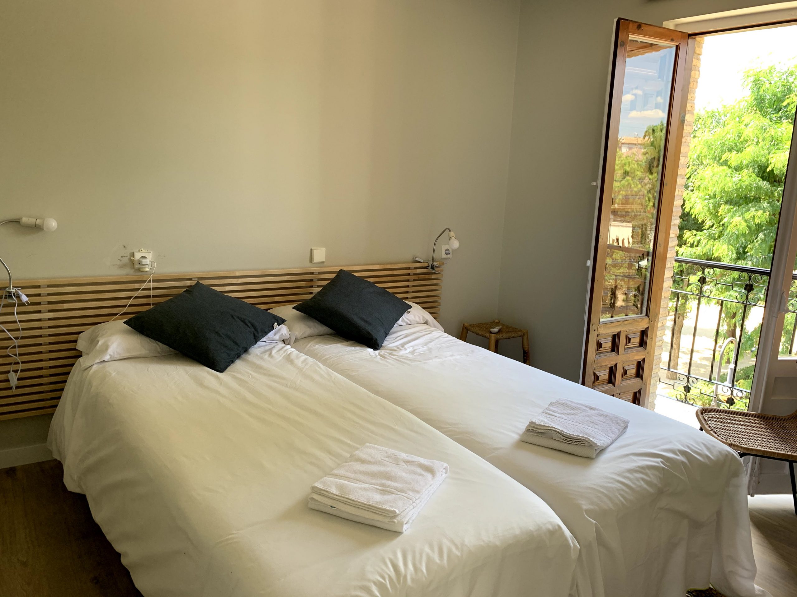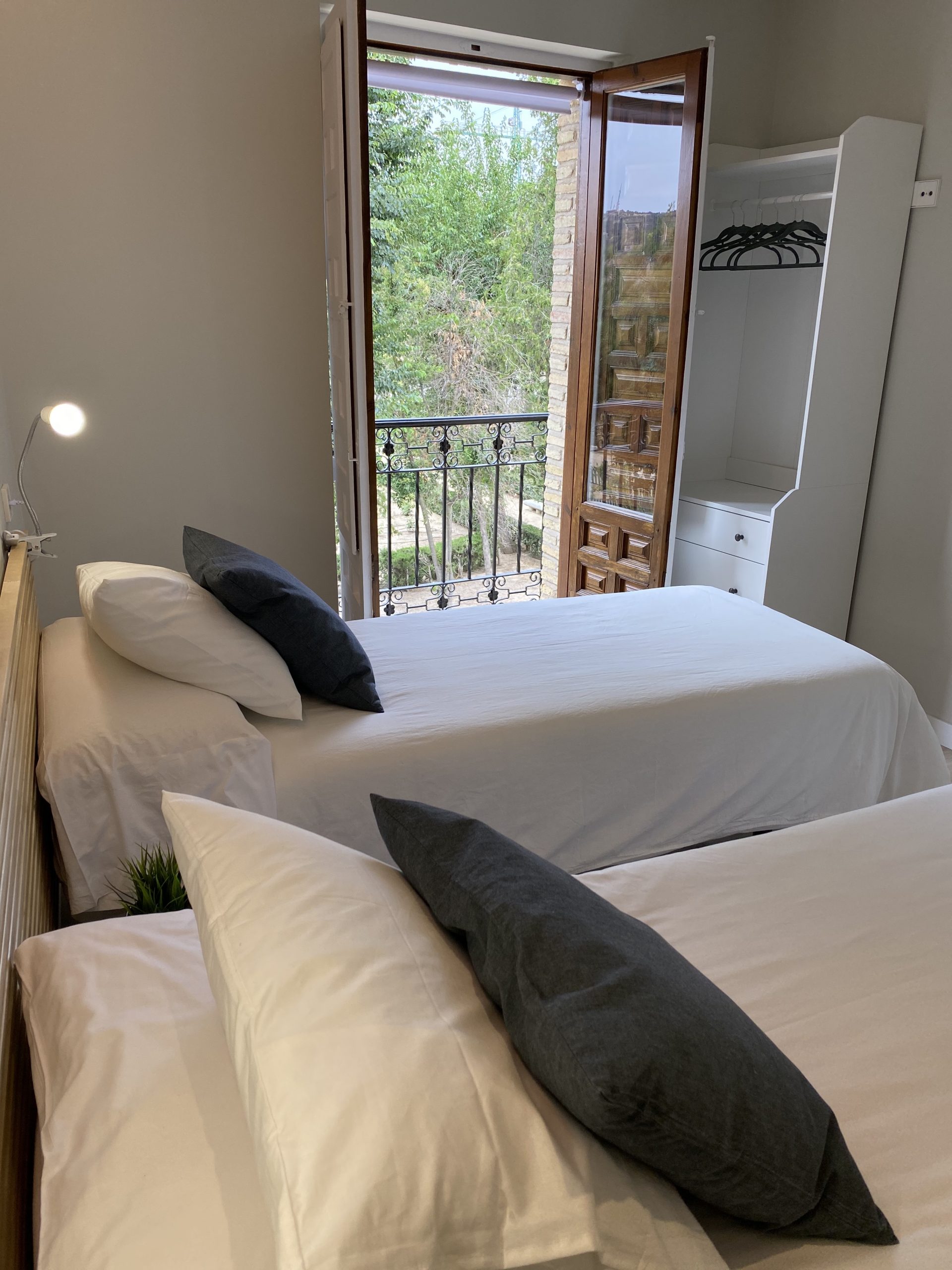 Suite privada exterior de 2 habitaciones con baño privado, recién reformada. Ideal para cuatro personas, ya que consta de un dormitorio independiente con cama de matrimonio (queen-size), dormitorio independiente con dos camas individuales. Está equipado con toallas, gel, champú, secador, armario abierto, Smart TV, mini nevera, tres balcones, microondas y máquina de café Dolce gusto. Ideal para disfrutar de una auténtica experiencia Toledana junto al barrio judío. Estarás en un edificio rehabilitado con las mejores calidades de materiales, con un patio interior típicamente toledano.